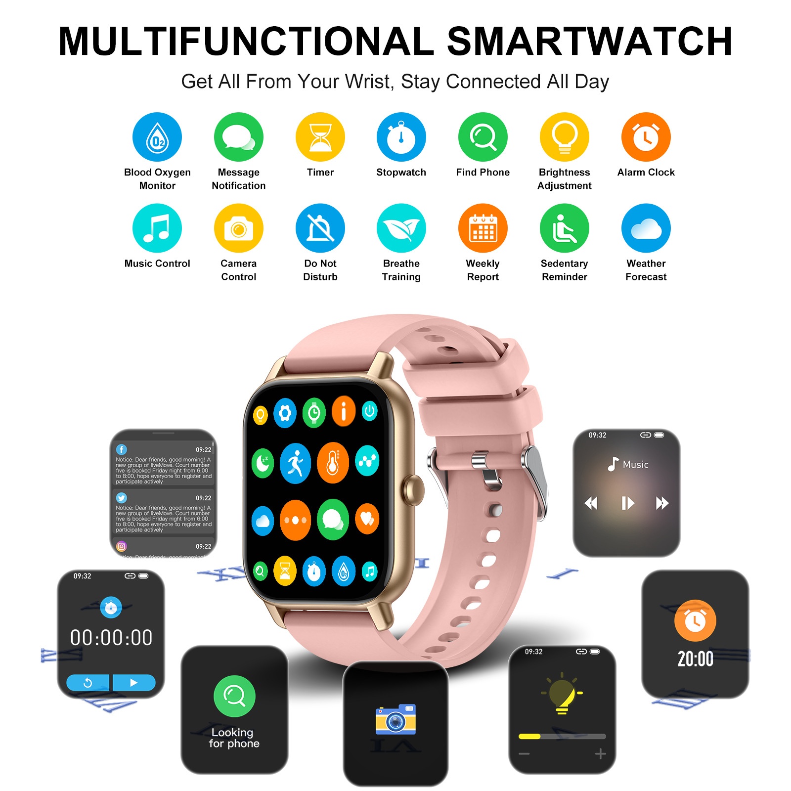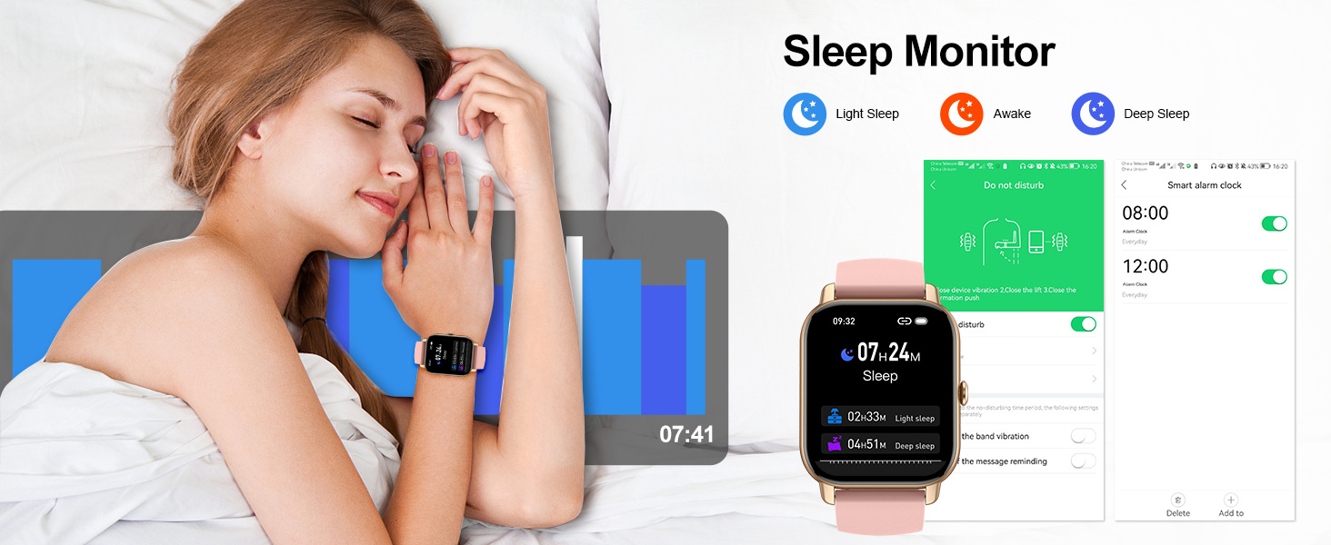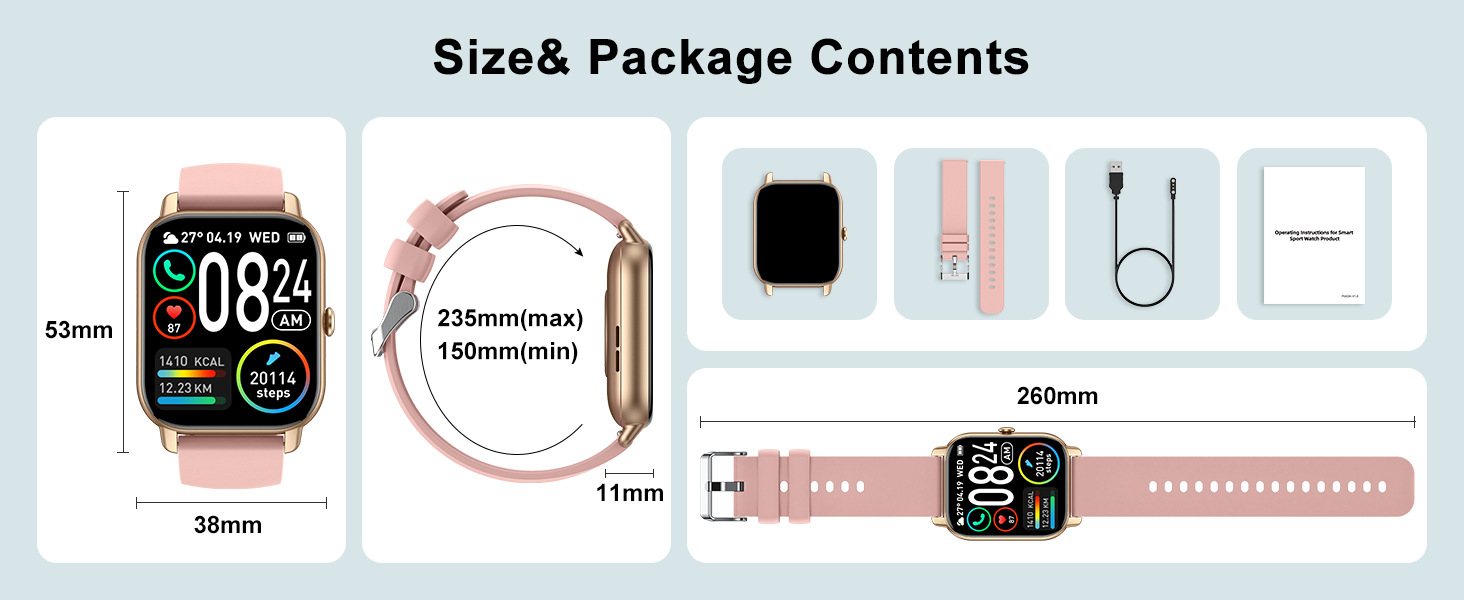 Functions: Waterproof, photographing, step counting, heart rate monitoring, social entertainment, Bluetooth calling, smart reminder, remote control selfie, sleep monitoring, blood oxygen detection